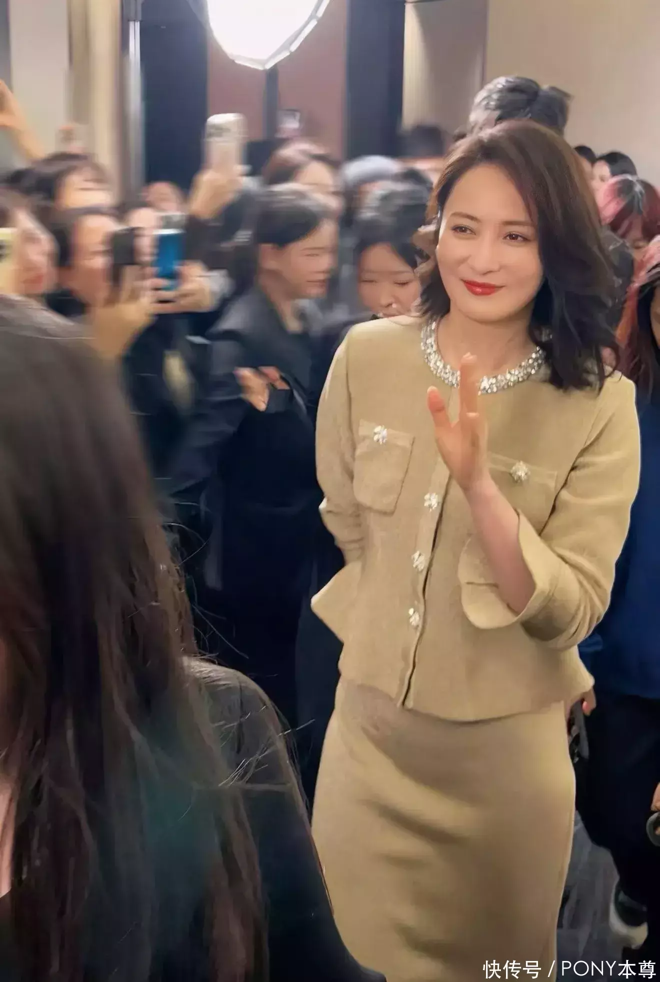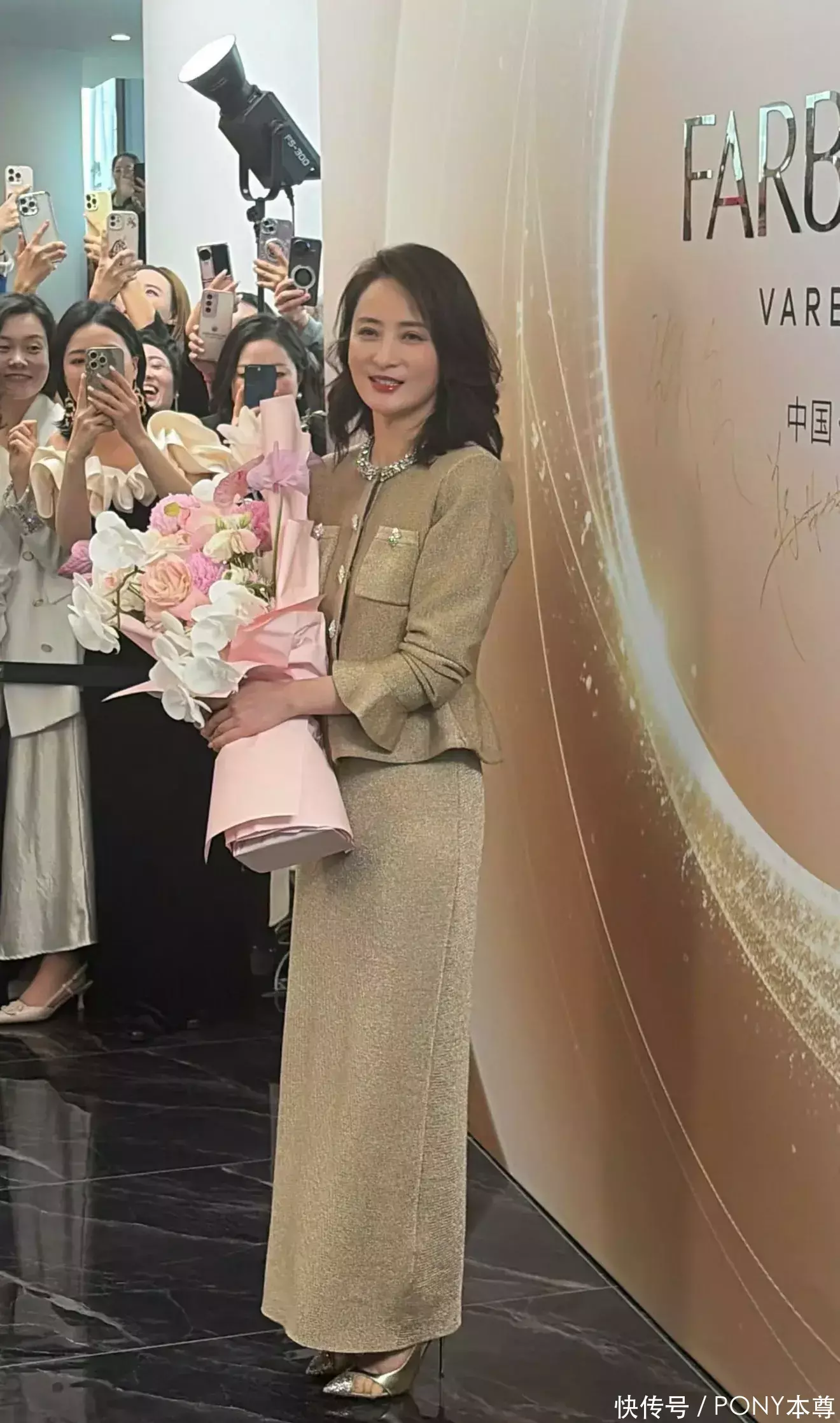 金棕色上衣收腰设计,凸显腰身,下半身搭配的同色系半身长裙,更显身材纤细!再搭配一双金色高跟鞋,仪态端庄,状态太好了!